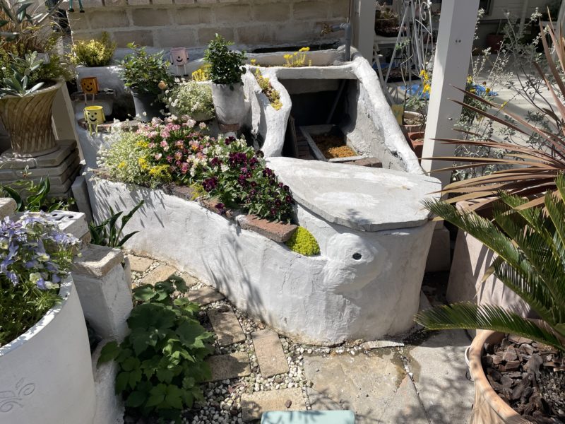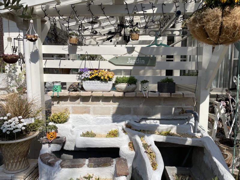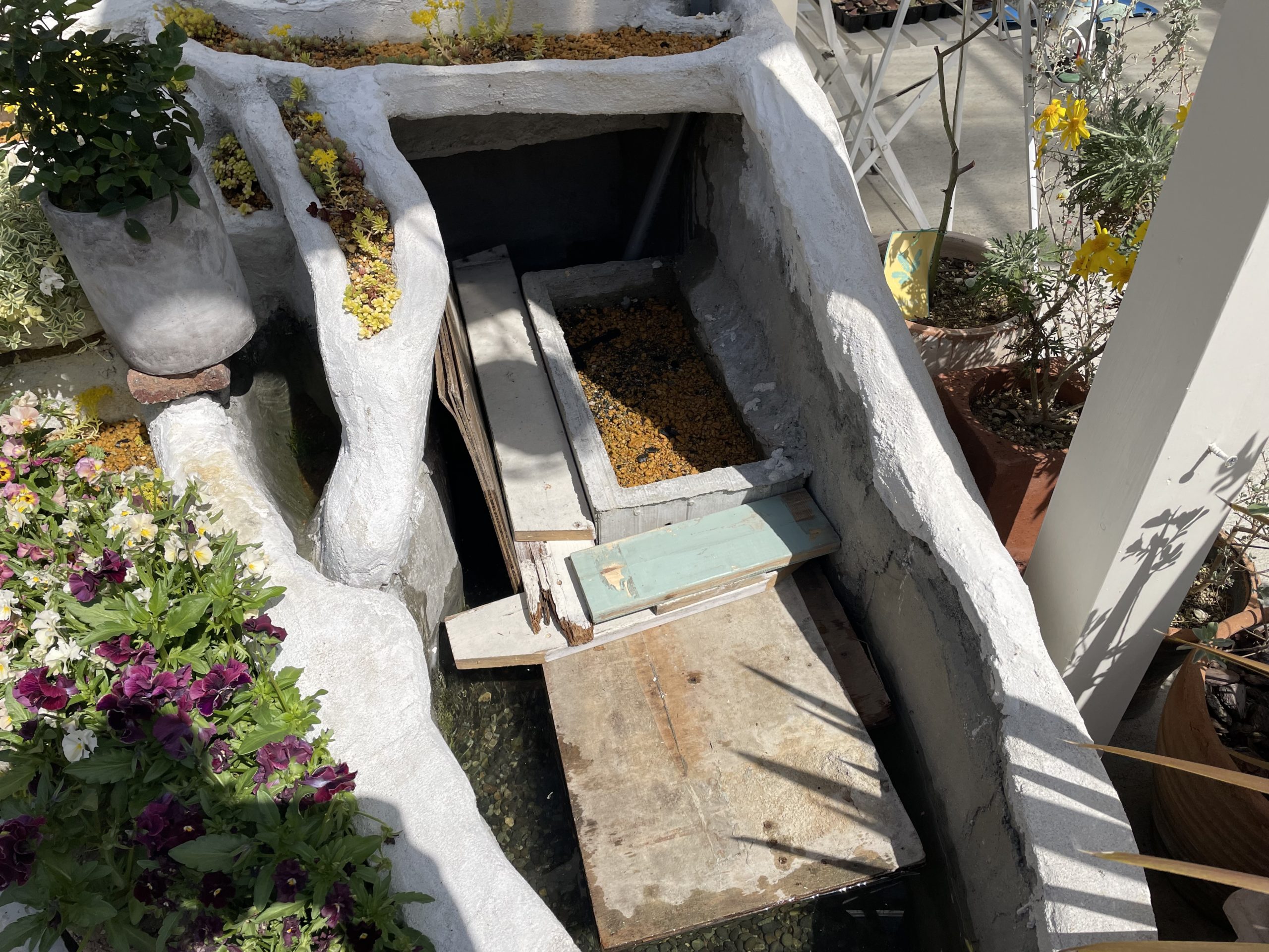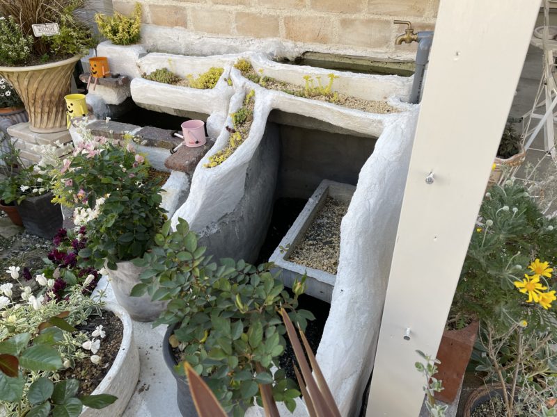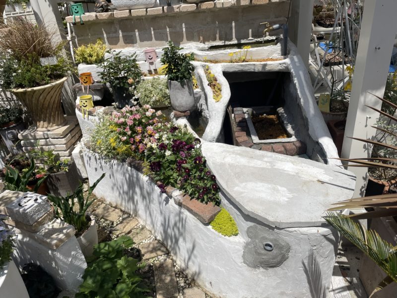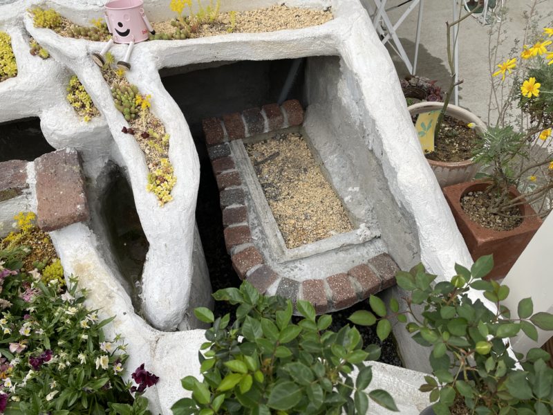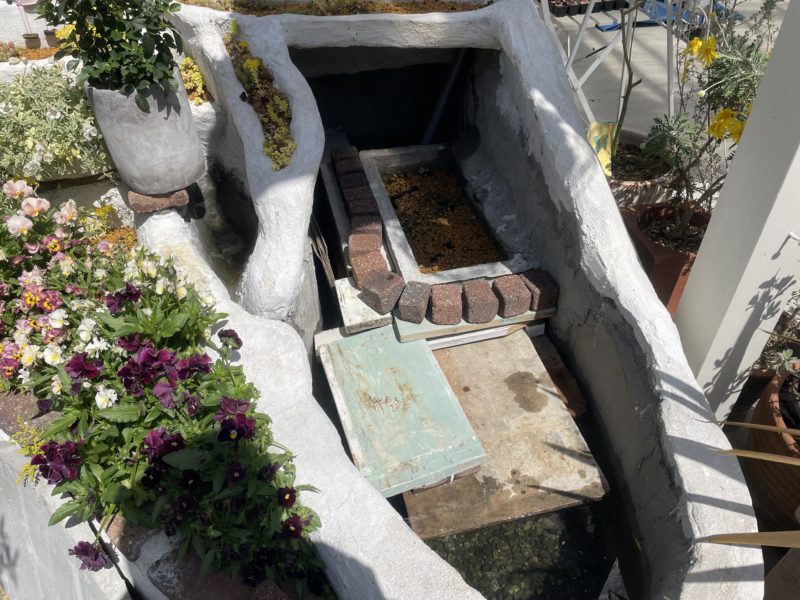 この花壇カメ池は小さな2つの池(上段のろ過池)と2つの大きな池(下段)で構成されています。