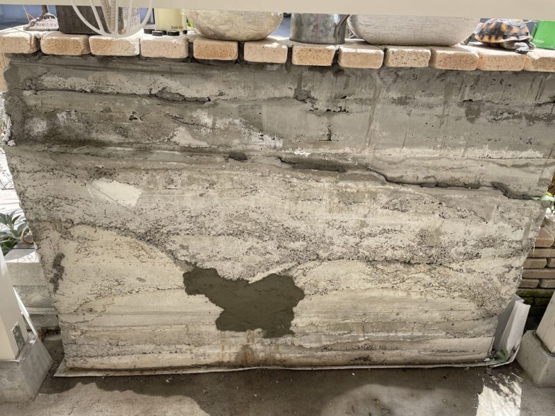 池の水を抜いたことでカメ池背面の水漏れも止まったので、背面全体に防水施工をしました。